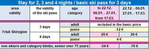 To every stay is included FRIULI SKIREGION ski pass, valid at these ski resorts: Tarvisio, Sella Nevea/Kanin, Ravascletto/Zoncolan, Piancavallo, Forni di Sopra. You do not need to ski only in one resort. In the table below you can see discounts and extra charges within the ski pass, which you have in the basic price according to the length of stay. If you need help, please email us age of passengers and we will help you with the calculations.