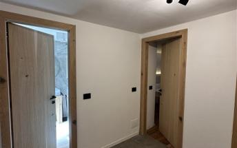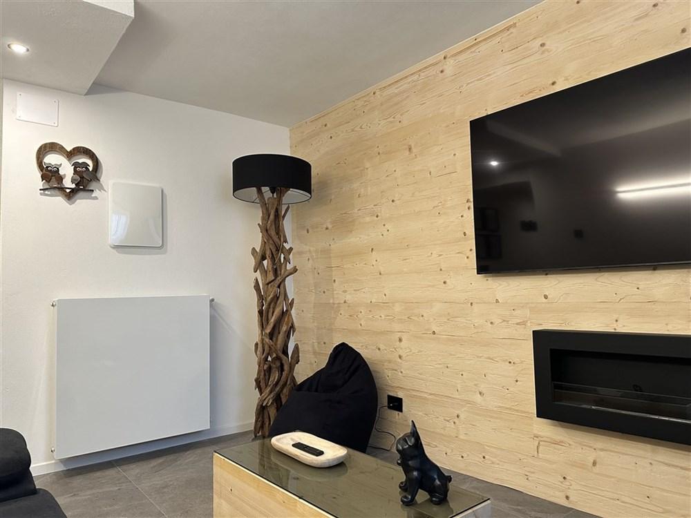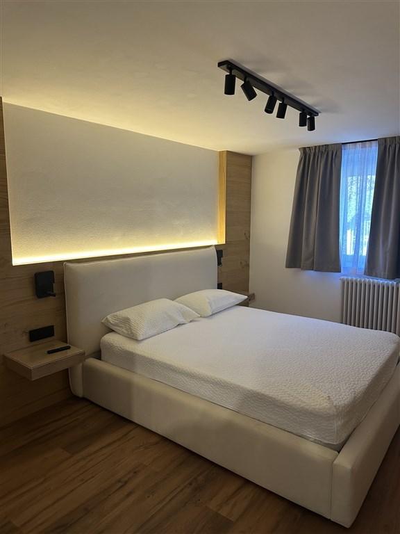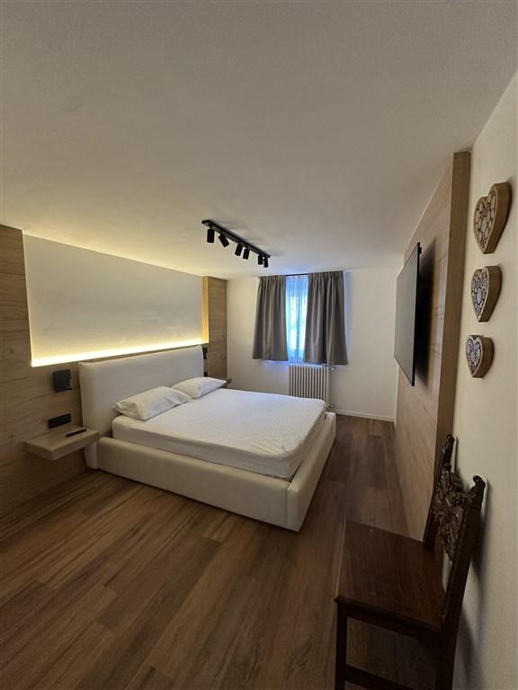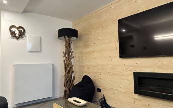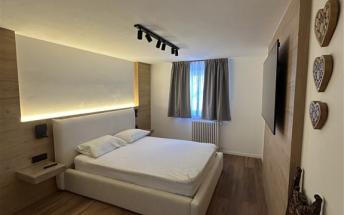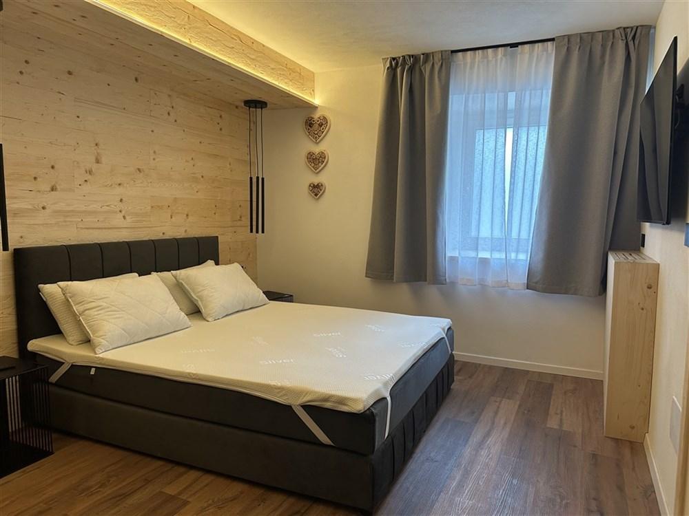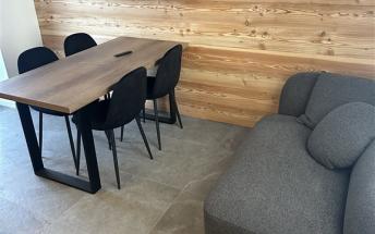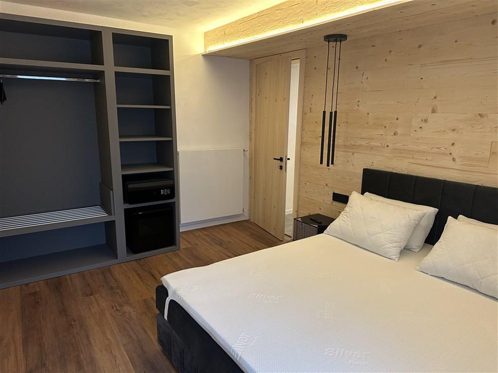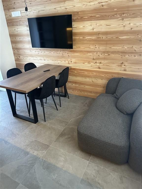 Bilo 4 Sole – 2. patro: světlý a prostorný apartmán s 1 ložnicí s manželskou postelí, obývací pokoj s kuchyňským koutem a rozkládacím gaučem pro 2 osoby, sociální zařízení, 2x terasa. Kombinuje teplo modřínového dřeva s moderní technologií a pohodlím