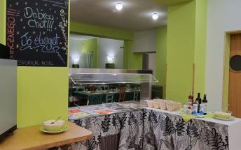 Večeře - formou bufetu s výběrem ze 3 teplých předkrmů (1 polévka a 2 druhy těstovin) a ze 2 druhých chodů s přílohou, bohatý salátový bufet, dezert nebo ovoce, voda v ceně, ostatní nápoje za poplatek